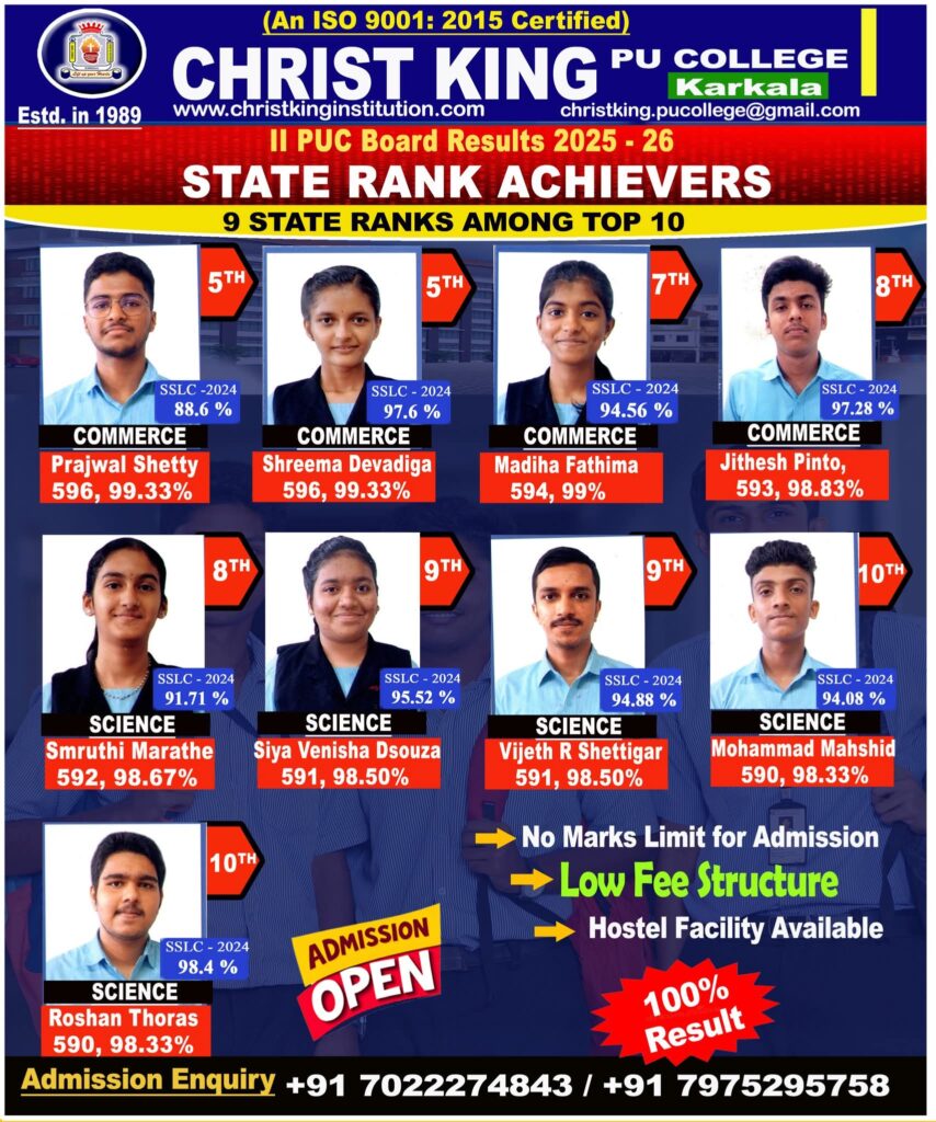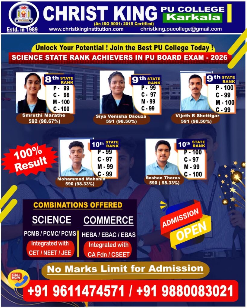 ಕಾರ್ಕಳದ ಕ್ರೈಸ್ಟ್ ಕಿಂಗ್ ಪದವಿಪೂರ್ವ ಕಾಲೇಜು (Christ King PU College) 2026ರ ಪಿಯುಸಿ ಫಲಿತಾಂಶದಲ್ಲಿ ಭರ್ಜರಿ ಸಾಧನೆ ಮಾಡಿದೆ