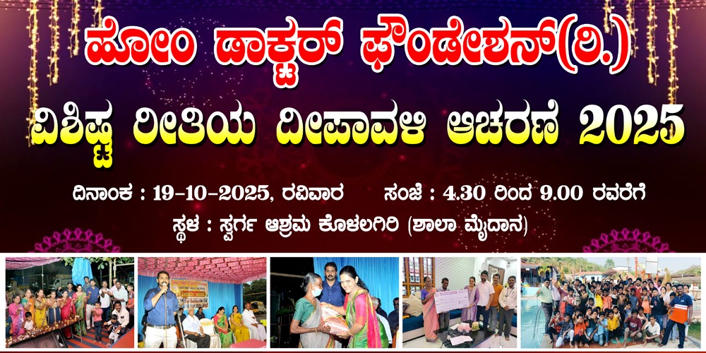 ಹೋಂ ಡಾಕ್ಟರ್ ಫೌಂಡೇಶನ್ ವಿಶಿಷ್ಟ ಆಚರಣೆ ಯಲ್ಲಿ 4 ನೆಯ ವರ್ಷದ ದೀಪಾವಳಿ ಆಚರಣೆ ಯನ್ನು ಕೊಳಲಗಿರಿಯ ಸ್ವರ್ಗ ಆಶ್ರಮದ ಮೈದಾನದಲ್ಲಿ ವಿಶಿಷ್ಟ ವಾಗಿ ಹಮ್ಮಿಕೊಳ್ಳಲಾಗಿದೆ.. ಕಾರ್ಯಕ್ರಮ ದಲ್ಲಿ ಒಟ್ಟು 11 ಅಸಹಾಯಕರಿಗೆ ಸಹಾಯದ ಚೆಕ್ ವಿತರಣೆ ಜೊತೆ ಅಸಹಾಯಕ ಕುಟುಂಬ ಗಳಿಗೆ ದಿನಸಿ ಸಾಮಗ್ರಿಗಳನ್ನು ವಿತರಿಸಲಾಗುವುದು … ಈ ಬಾರಿ ನಮ್ಮ ಸ್ವರ್ಗ ಆಶ್ರಮದ ಅಸಹಾಯಕ ದೇವರ ಮಕ್ಕಳ ಜೊತೆ ಸೇರಿ, ಅವರೇ ತಯಾರಿಸಿದ ಹಣತೆ ಗಳನ್ನು ಬೆಳಗಿಸಿ ಹಬ್ಬದ ಆಚರಣೆ ಮಾಡುವ ಸಂತಸದ ಜೊತೆಗೆ, ಅದೇ ಅಸಹಾಯಕರು ತಯಾರಿಸಿದ ಅತ್ರಾಸ (ಕಜ್ಜಾಯ ) ವನ್ನು ಮಾರಾಟ ಕ್ಕಿಟ್ಟಿದ್ದು ಈ ಅಸಹಾಯಕರ ಮುಖದಲ್ಲಿ ಒಂದು ಮಂದಹಾಸ ಮೂಡಿಸ ಬಲ್ಲದು. ಈ ಸಂದರ್ಭದಲ್ಲಿ ಗಿಚ್ಚಿ ಗಿಲಿ ಗಿಲಿ ಖ್ಯಾತಿಯ ದೀಕ್ಷಾ ಬ್ರಹ್ಮಾವರ ಅವರ ತಂಡದ ಕಾರ್ಯಕ್ರಮ ವೂ ಇದ್ದು ಒಟ್ಟಲ್ಲಿ ನಿಮ್ಮನ್ನು ನಗೆ ಕಡಲಲ್ಲಿ ತೇಲಿಸಲಿದೆ, ಹಾಗೆ ನಮ್ಮ ಅಸಹಾಯಕ ವೃದ್ಧರ ಕಾರ್ಯಕ್ರಮ ವೂ ಇದ್ದು ಒಟ್ಟಲ್ಲಿ ಮನರಂಜನೆ ಜೊತೆ ವಿಶಿಷ್ಟ ಶೈಲಿಯ ಹಬ್ಬದ ಆಚರಣೆಗೆ ಸಾಕ್ಷಿ ಯಾಗಲಿದ್ದೇವೆ.. ಬನ್ನಿ ಈ ವಿಶಿಷ್ಟ ಕಾರ್ಯಕ್ರಮ ದಲ್ಲಿ ನೀವೂ ಪಾಲ್ಗೊಳ್ಳಿ 🙏🙏..