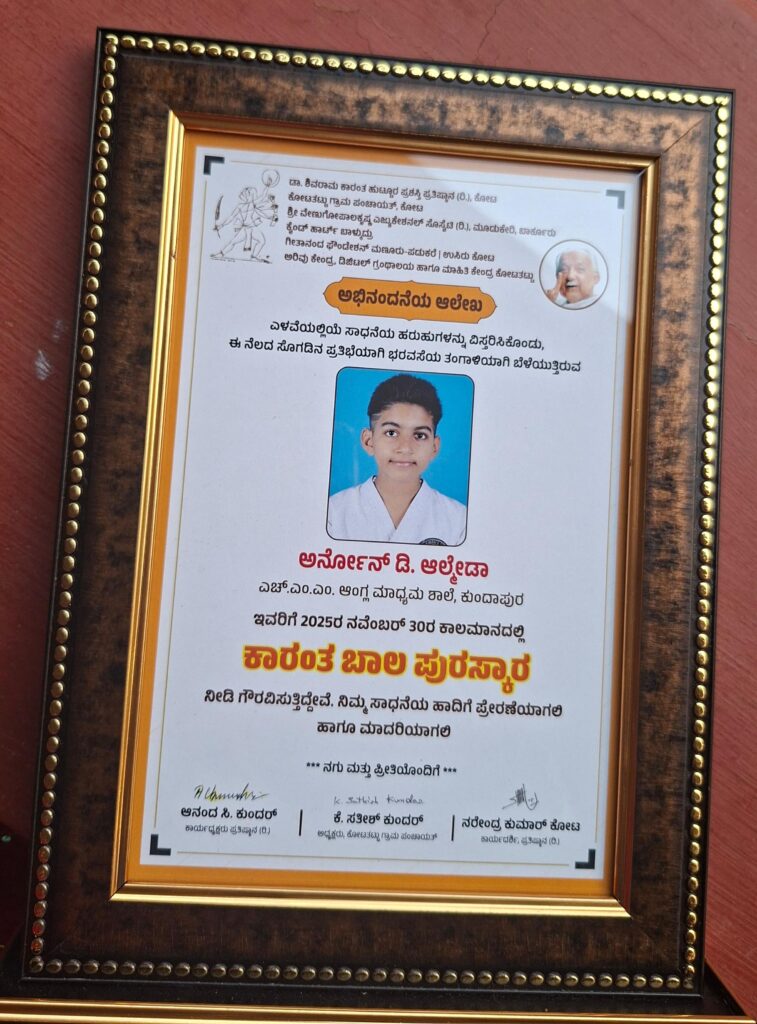 ಡಾ. ಶಿವರಾಮ ಹುಟ್ಟೂರ ಪ್ರಶಸ್ತಿ ಪ್ರತಿಷ್ಠಾನ, ಕೋಟಾತಟ್ಟು ಅರಿವು ಕೇಂದ್ರ ಡಿಜಿಟಲ್ ಗ್ರಂಥಾಲಯ ಹಾಗೂ ಮಾಹಿತಿ ಕೇಂದ್ರದ ವತಿಯಿಂದ ನವೆಂಬರ್ 30.ರಂದು ಡಾ. ಶಿವರಾಮ ಕಾರಂತ ಥೀಮ್ ಪಾರ್ಕ್ ನಲ್ಲಿ 5ನೇ ವರ್ಷದ ಡಾ. ಶಿವರಾಮ ಕಾರಂತ ಬಾಲ ಪುರಸ್ಕಾರ ವನ್ನು ಬಾಲ ಪ್ರತಿಭೆ ಎಚ್ ಎಮ್ ಎಮ್ ಆಂಗ್ಲ ಮಾಧ್ಯಮ ಶಾಲೆಯ 6ನೇ ತರಗತಿಯ ವಿದ್ಯಾರ್ಥಿ ಅರ್ನೋನ್ ಡಿ ಅಲ್ಮೆಡ ಇವರಿಗೆ ಪ್ರಧಾನ ಮಾಡಲಾಯಿತು..
