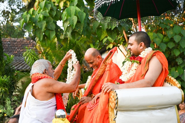 ಇದಕ್ಕೂ ಮುನ್ನ ಸಾಲಂಕೃತ ತೆರೆದ ವಾಹನದಲ್ಲಿ ಯತಿದ್ವಯರನ್ನು ಮೆರವಣಿಗೆ ಮೂಲಕ ಭಕ್ತಿ ಗೌರವಗಳೊಂದಿಗೆ ಬರಮಾಡಿಕೊಳ್ಳಲಾಯಿತು.