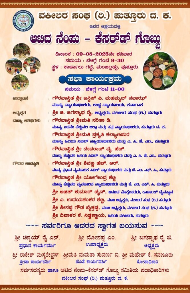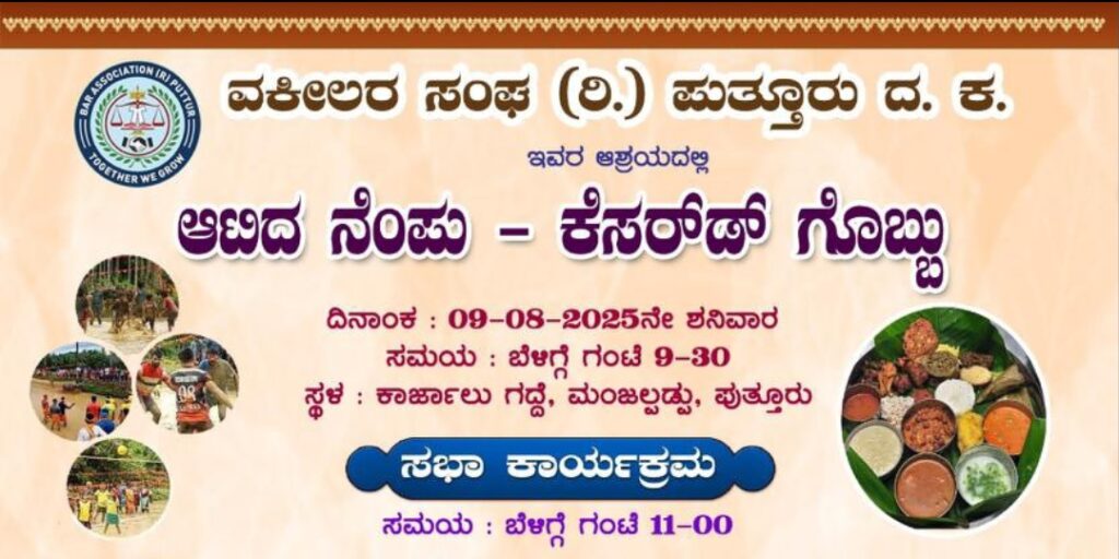 ವಕೀಲರ ಸಂಘ(ರಿ.) ಪುತ್ತೂರು ಇದರ ವತಿಯಿಂದ ಆಟಿದ ನೆಂಪು ಕೆಸರ್ಡ್ ಗೊಬ್ಬು ಕಾರ್ಯಕ್ರಮ ಆ.09 ರಂದು ಬೆಳಗ್ಗೆ 9.30 ಕ್ಕೆ ಕಾರ್ಜಾಲು ಗದ್ದೆಯಲ್ಲಿ ನಡೆಯಲಿದೆ.