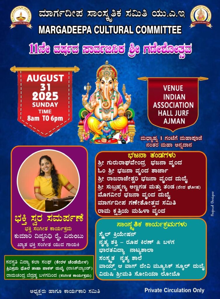 UAE: ಮಾರ್ಗದೀಪ ಸಾಂಸ್ಕೃತಿಕ ಸಮಿತಿ ಯು.ಎ.ಇ 11ನೇ ವರ್ಷದ ಸಾರ್ವಜನಿಕ ಶ್ರೀ ಗಣೇಶೋತ್ಸವ ಆಗಸ್ಟ್ 31 ಭಾನುವಾರ 2025 ಬೆಳಿಗ್ಗೆ 8am ನಿಂದ ಸಾಯಂಕಾಲ 6 ಗಂಟೆ ವರೆಗೆ ನೆರವೇರಲಿದೆ, ಈ ಕಾರ್ಯಕ್ರಮವು ಇಂಡಿಯನ್ ಅಸೋಸಿಯೇಷನ್ ಹಾಲ್ ಅಜಮಾನ್ ನಡೆಯಲಿದೆ