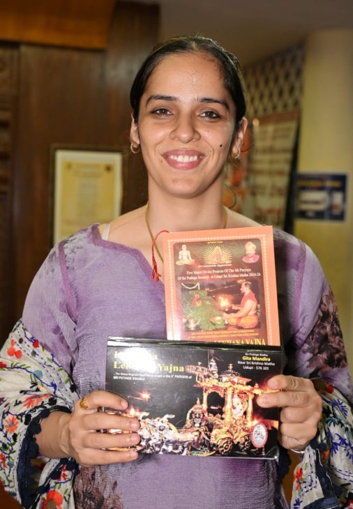 ಭಾರತದ ಬ್ಯಾಡ್ಮಿಂಟನ್ ಆಟಗಾರ್ತಿ ಪದ್ಮಭೂಷಣ, ಪದ್ಮಶ್ರೀ ಪುರಸ್ಕೃತೆ ಸೈನಾ ನೆಹವಾಲ್ ಶ್ರೀಕೃಷ್ಣಮಠಕ್ಕೆ ಭೇಟಿನೀಡಿ ಶ್ರೀಕೃಷ್ಣ ದೇವರ ದರ್ಶನ ಮಾಡಿ ಪರ್ಯಾಯ ಶ್ರೀ ಪುತ್ತಿಗೆ ಕಿರಿಯ ಶ್ರೀಪಾದರಾದ ಶ್ರೀ ಶ್ರೀ ಸುಶ್ರೀಂದ್ರ ತೀರ್ಥ ಶ್ರೀಪಾದರಿಂದ ಕೋಟಿಗೀತಾ ಲೇಖನ ಯಜ್ಞ ದೀಕ್ಷೆ ಸ್ವೀಕರಿಸಿ ಅನುಗ್ರಹ ಪಡೆದರು