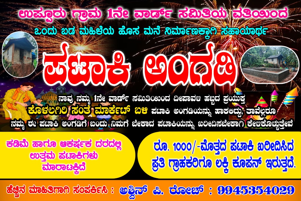 ಉಪ್ಪೂರು ಗ್ರಾಮ 1ನೇ ವಾರ್ಡ್ ಸಮಿತಿಯ ವತಿಯಿಂದ ಒಂದು ಬಡ ಮಹಿಳೆಯ ಹೊಸ ಮನೆ ನಿರ್ಮಾಣಕ್ಕಾಗಿ ಸಹಾಯಾರ್ಥ ಪಟಾಕಿ ಅಂಗಡಿ
